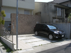 モダンさと高級感のある車庫スペース並列駐車スペースにMシェードを用いた直線的でシンプルなプランです。